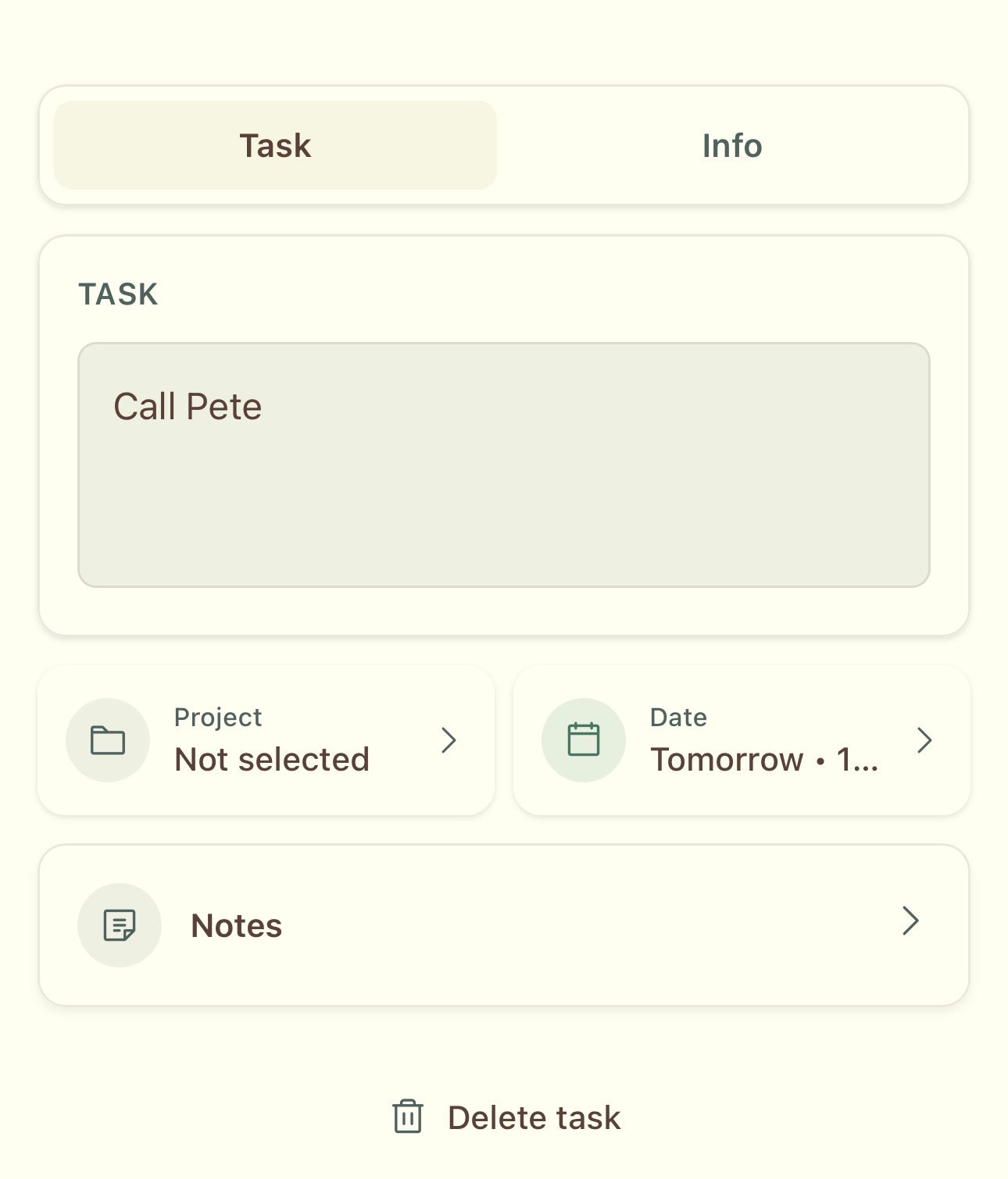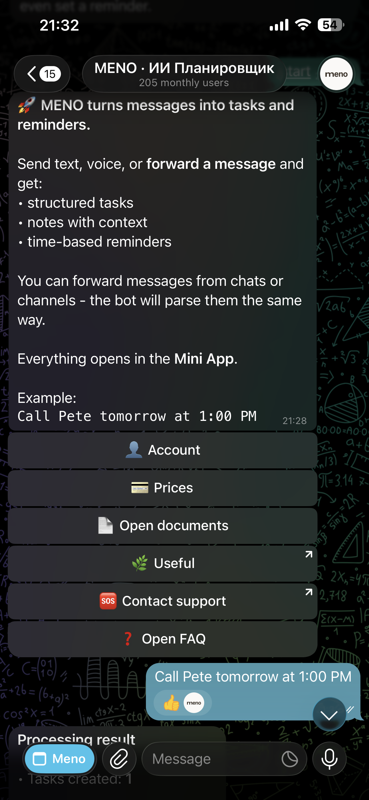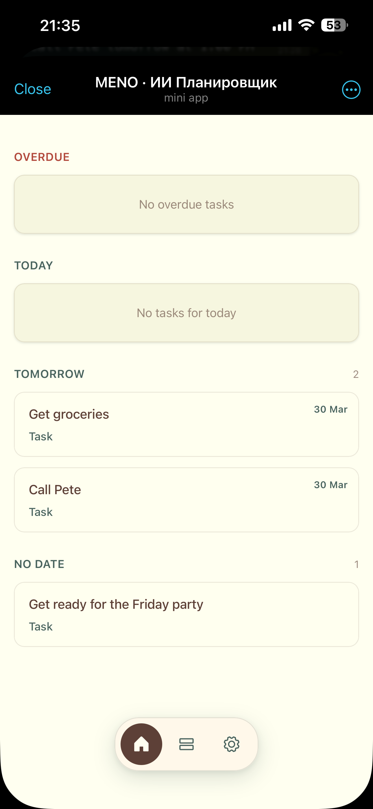 Text, forwarded messages, and voice notes all go into one place. MENO pulls out tasks and notes, figures out time, and reminds you without turning it into extra interface.