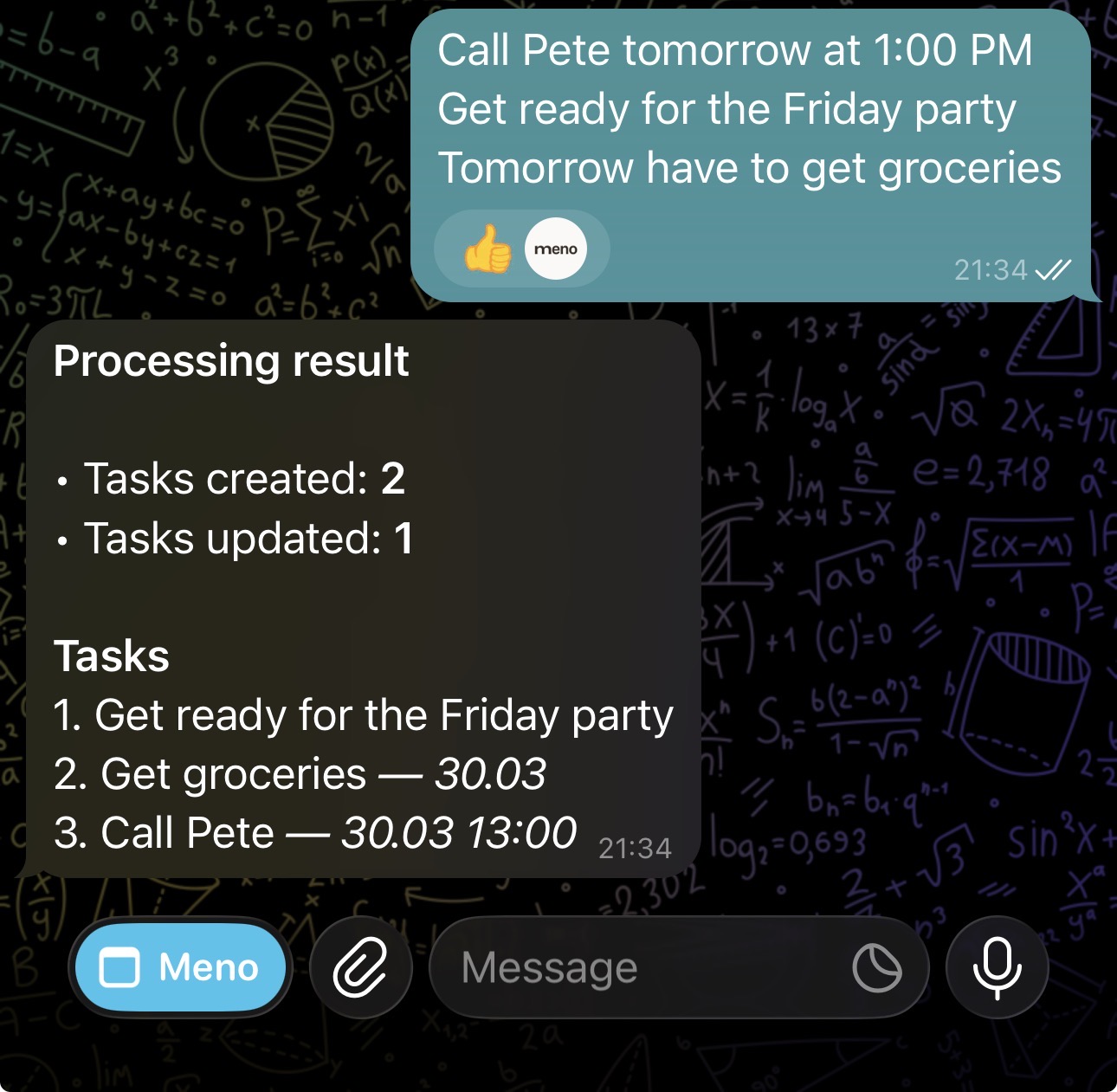 A message can be long, messy, and conversational. MENO pulls out the meaning and turns it into tasks, notes, and timing.